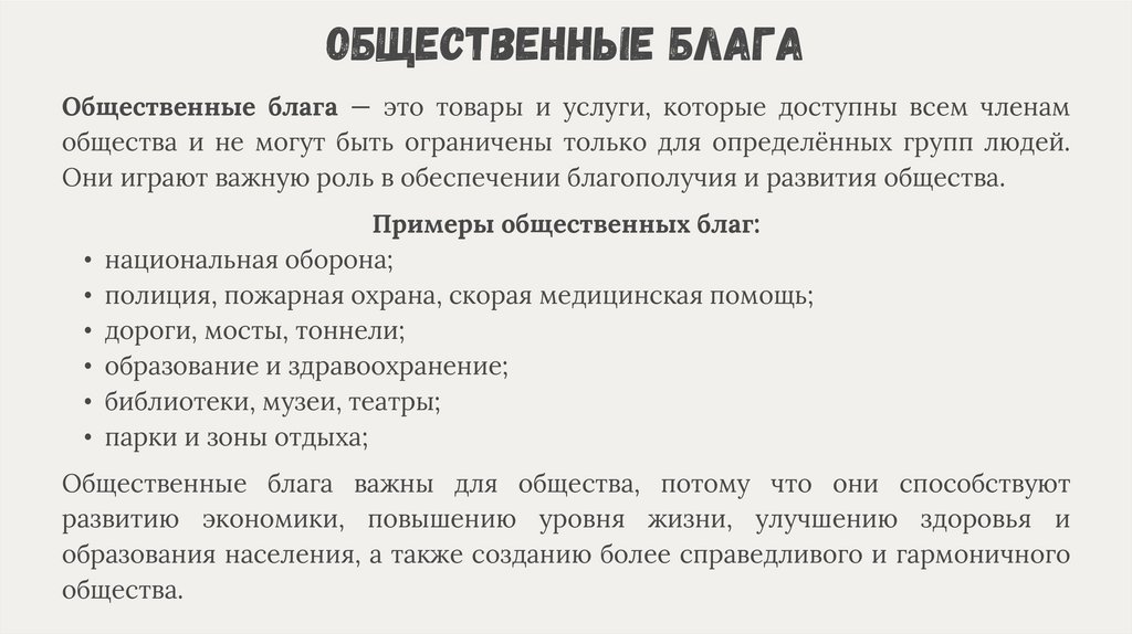 Общественные благаОбщественные блага — это товары и услуги, которые доступны всем членам