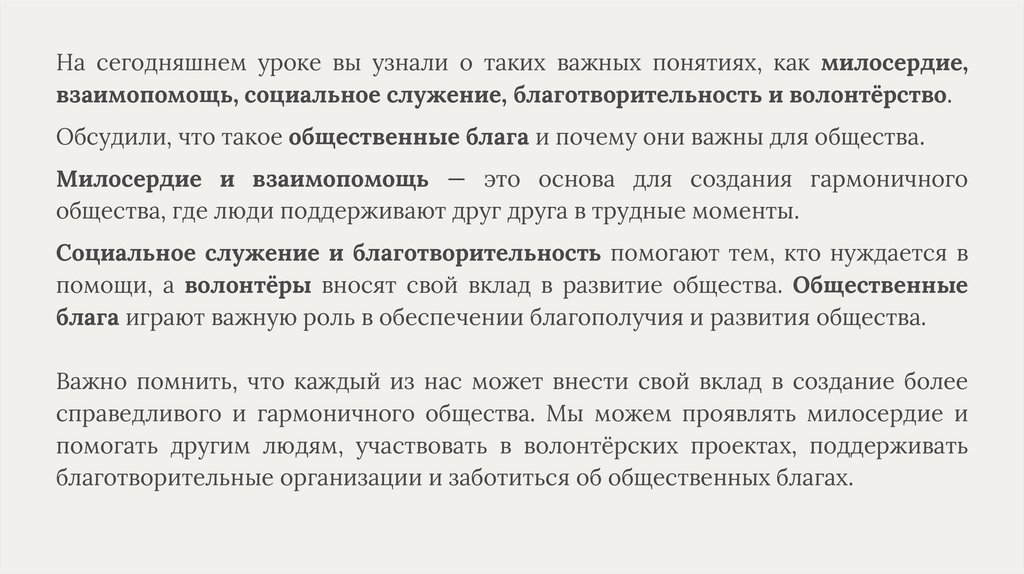На сегодняшнем уроке вы узнали о таких важных понятиях, как милосердие,взаимопомощь, социальное служение, благотворительность и волонтёрство.