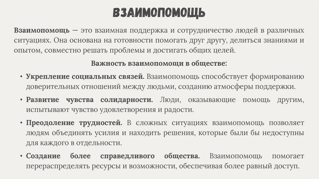 • Укрепление социальных связей. Взаимопомощь способствует формированию