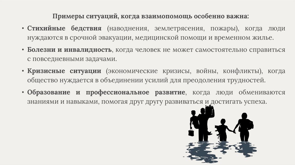 Примеры ситуаций, когда взаимопомощь особенно важна:• Стихийные бедствия (наводнения, землетрясения, пожары), когда люди