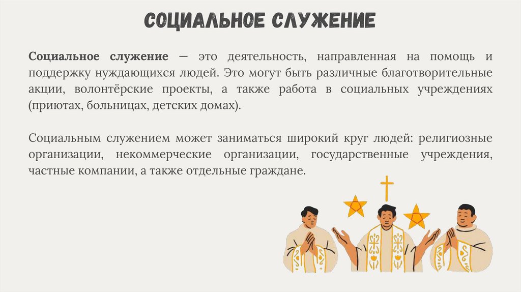 Социальное служениеСоциальное служение — это деятельность, направленная на помощь и