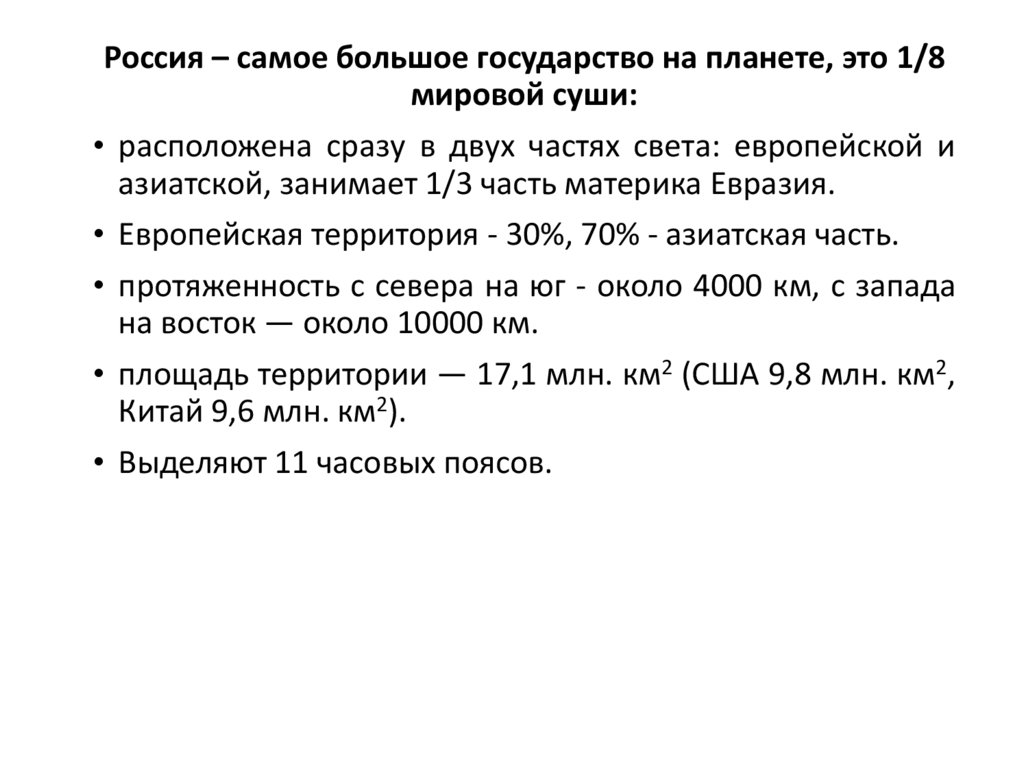 Россия – самое большое государство на планете, это 1/8мировой суши: