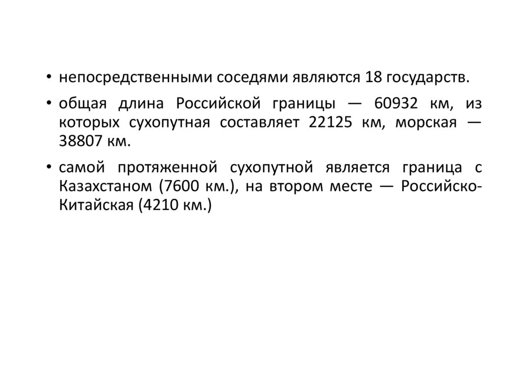 • непосредственными соседями являются 18 государств.• общая длина Российской границы — 60932 км, из