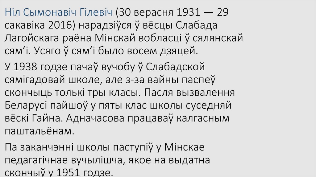 Ніл Сымонавіч Гілевіч (30 верасня 1931 — 29сакавіка 2016) нарадзіўся ў вёсцы Слабада
