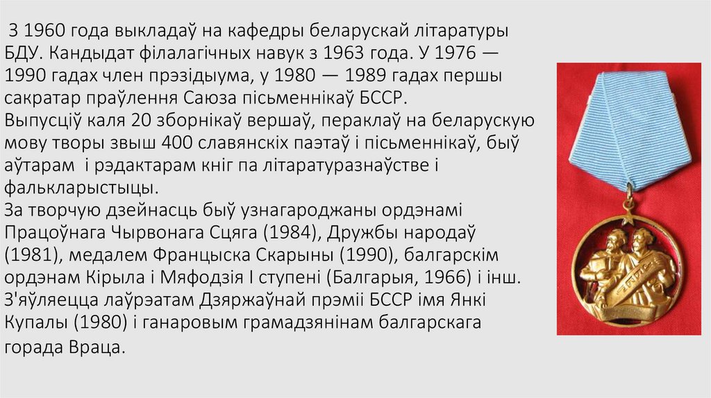 (1981), медалем Францыска Скарыны (1990), балгарскім