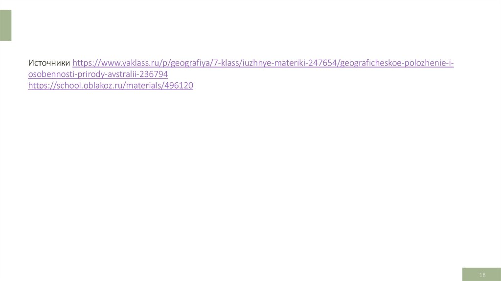 Источники https://www.yaklass.ru/p/geografiya/7-klass/iuzhnye-materiki-247654/geograficheskoe-polozhenie-iosobennosti-prirody-avstralii-236794https://school.oblakoz.ru/materials/496120
