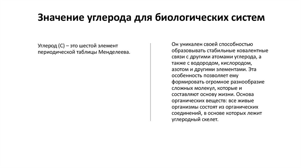 Значение углерода для биологических системУглерод (C) – это шестой элемент