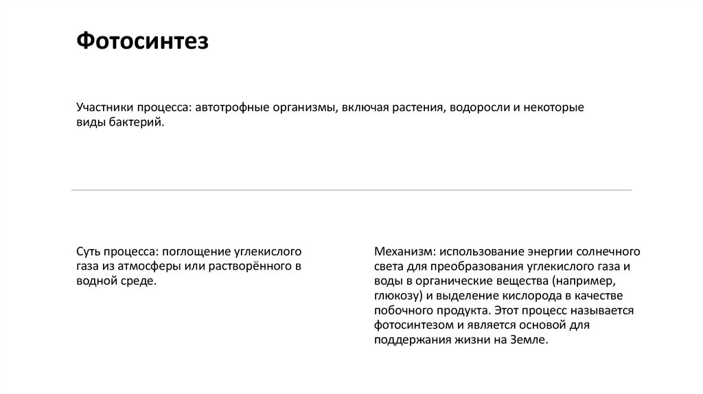 ФотосинтезУчастники процесса: автотрофные организмы, включая растения, водоросли и некоторые