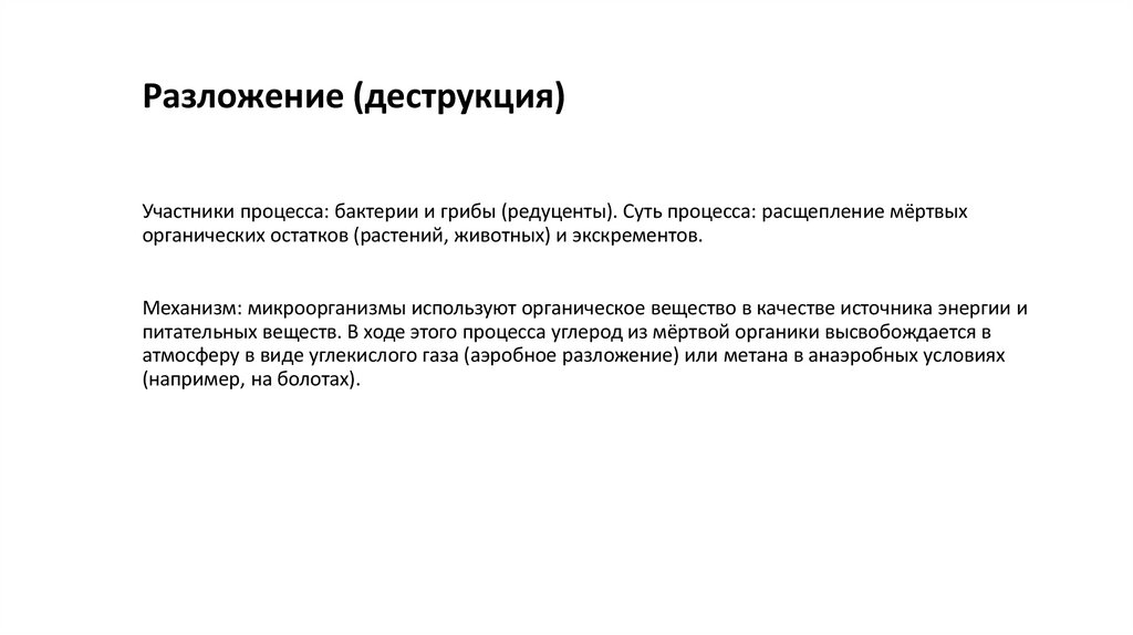 Разложение (деструкция)Участники процесса: бактерии и грибы (редуценты). Суть процесса: расщепление мёртвых