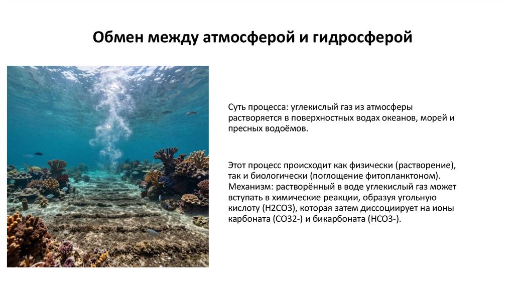 Обмен между атмосферой и гидросферойСуть процесса: углекислый газ из атмосферы