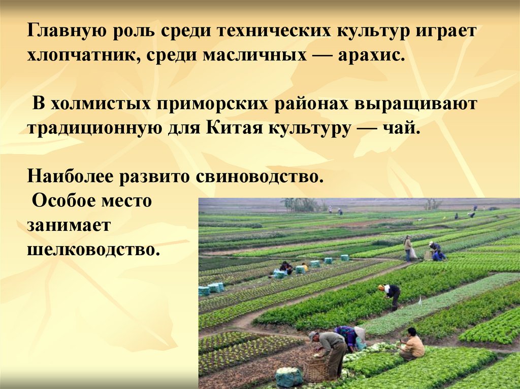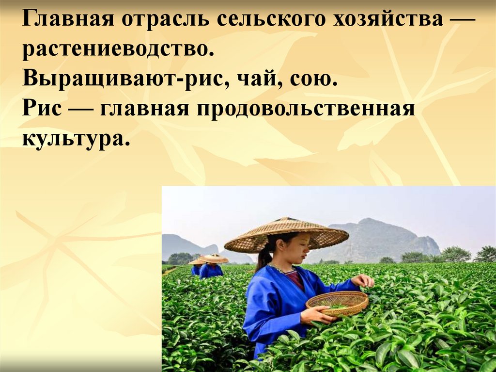 Выращивают-рис, чай, сою.