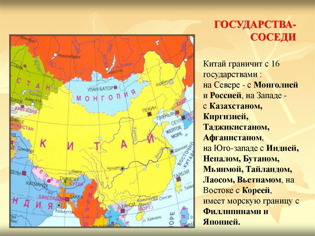 ГОСУДАРСТВАСОСЕДИКитай граничит с 16