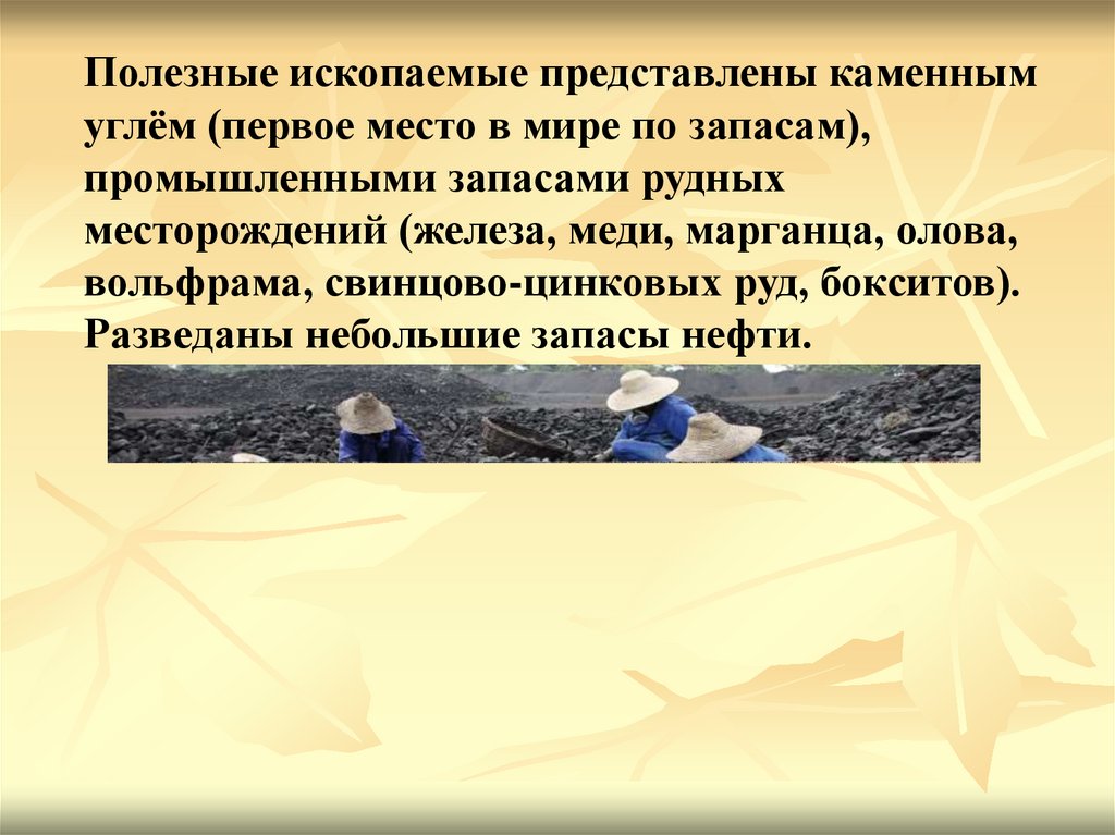 Полезные ископаемые представлены каменнымуглём (первое место в мире по запасам),