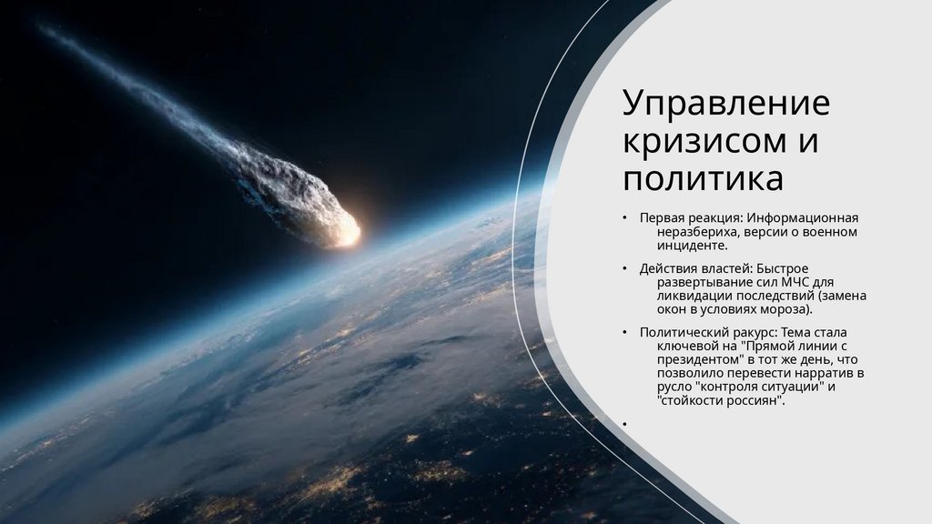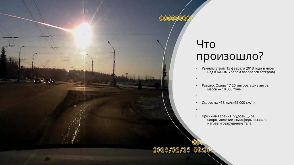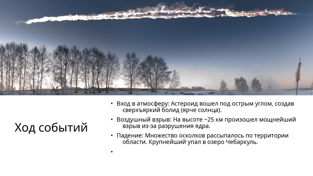 • Вход в атмосферу: Астероид вошел под острым углом, создавсверхъяркий болид (ярче солнца).