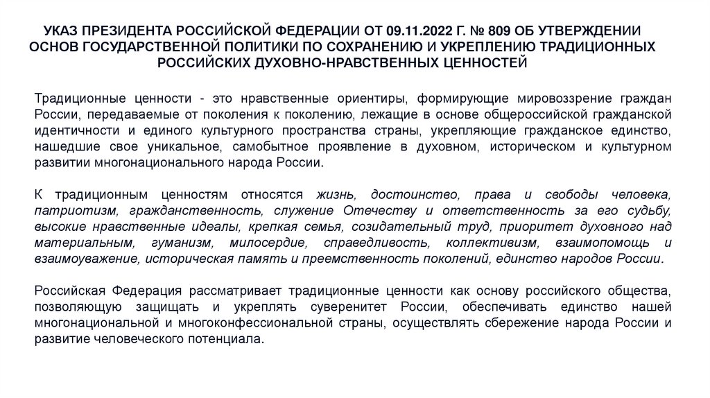 УКАЗ ПРЕЗИДЕНТА РОССИЙСКОЙ ФЕДЕРАЦИИ ОТ 09.11.2022 Г. № 809 ОБ УТВЕРЖДЕНИИОСНОВ ГОСУДАРСТВЕННОЙ ПОЛИТИКИ ПО СОХРАНЕНИЮ И УКРЕПЛЕНИЮ ТРАДИЦИОННЫХ