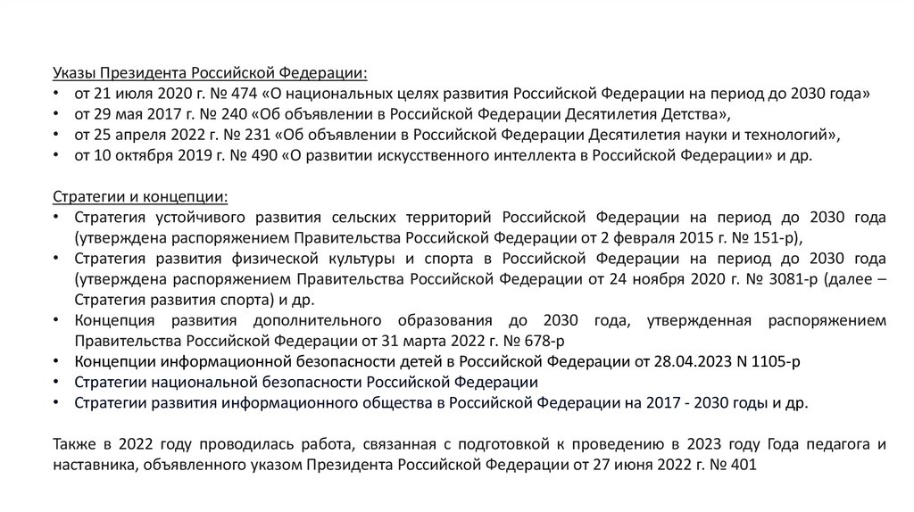 Указы Президента Российской Федерации:• от 21 июля 2020 г. № 474 «О национальных целях развития Российской Федерации на период до 2030 года»