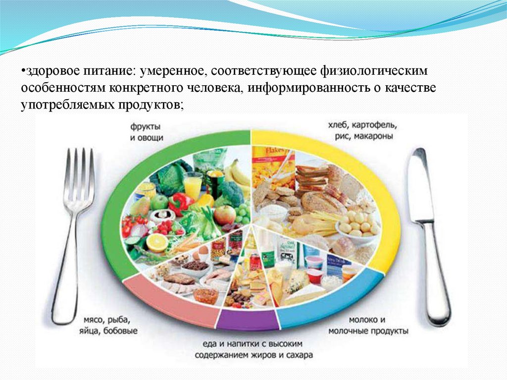 •здоровое питание: умеренное, соответствующее физиологическимособенностям конкретного человека, информированность о качестве