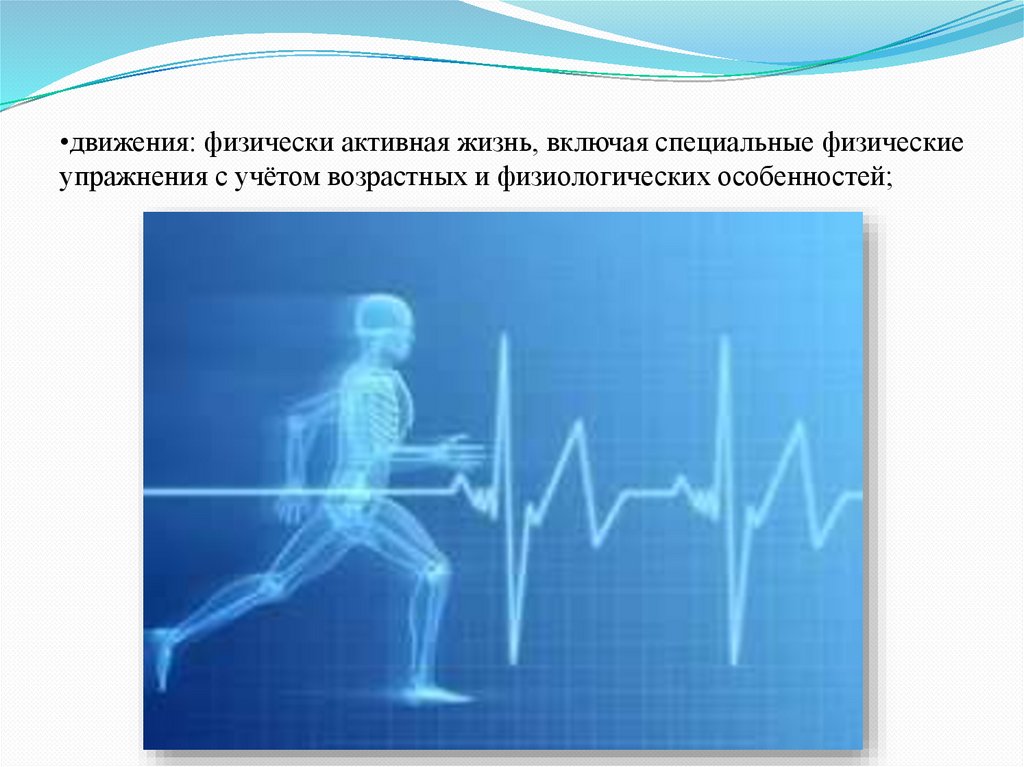 •движения: физически активная жизнь, включая специальные физическиеупражнения с учётом возрастных и физиологических особенностей;
