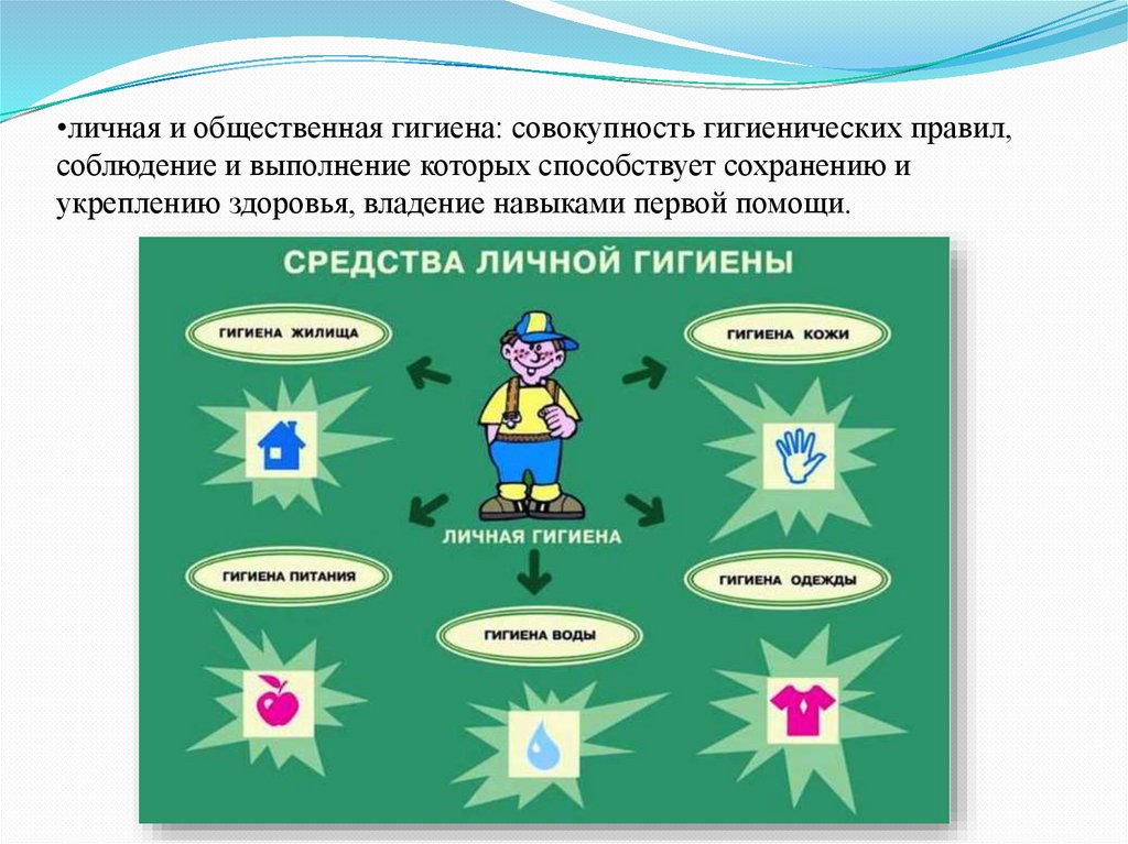 •личная и общественная гигиена: совокупность гигиенических правил,соблюдение и выполнение которых способствует сохранению и