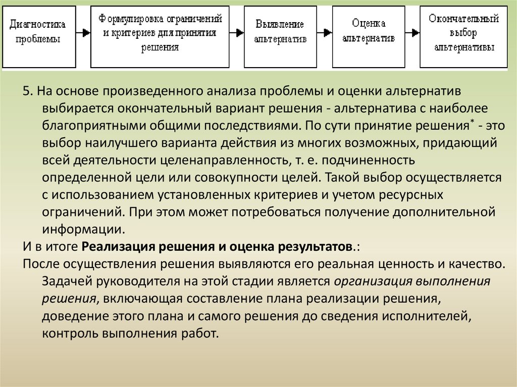 5. На основе произведенного анализа проблемы и оценки альтернативвыбирается окончательный вариант решения - альтернатива с наиболее