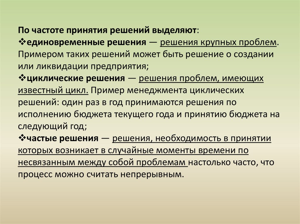По частоте принятия решений выделяют:единовременные решения — решения крупных проблем.
