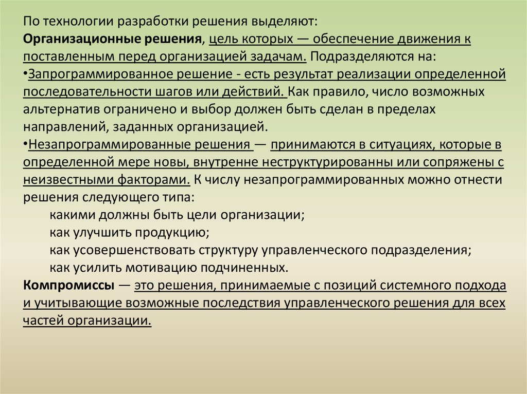 По технологии разработки решения выделяют:Организационные решения, цель которых — обеспечение движения к