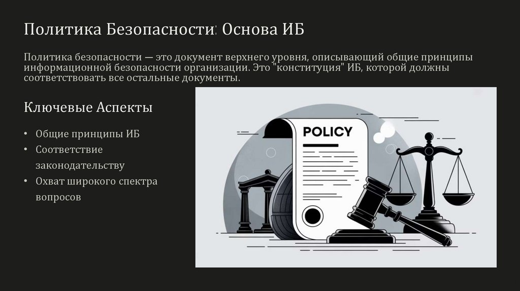 Политика Безопасности: Основа ИБПолитика безопасности — это документ верхнего уровня, описывающий общие принципы