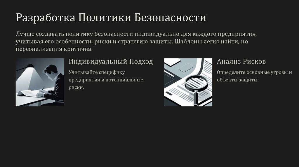 Разработка Политики БезопасностиЛучше создавать политику безопасности индивидуально для каждого предприятия,