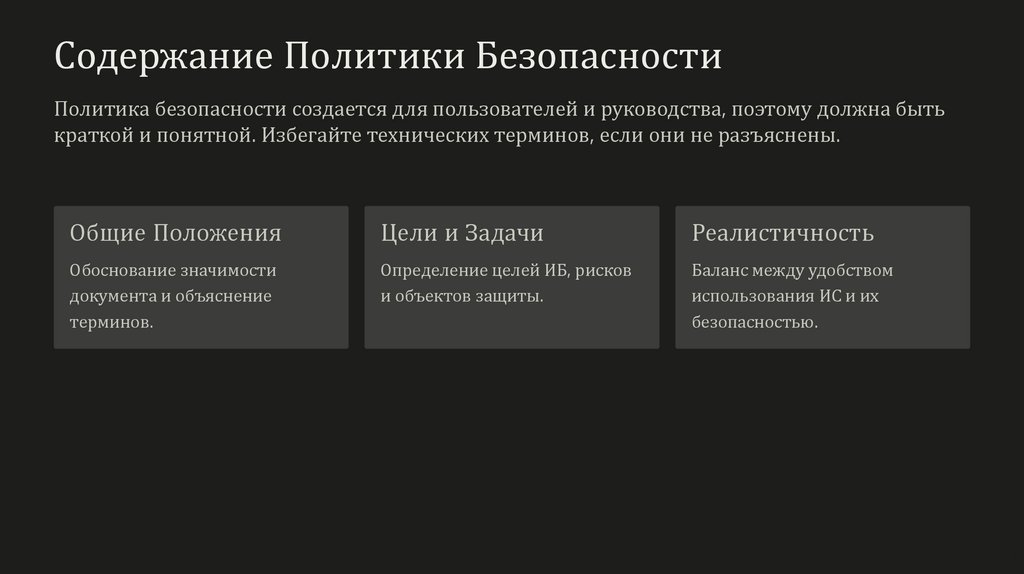 Содержание Политики БезопасностиПолитика безопасности создается для пользователей и руководства, поэтому должна быть