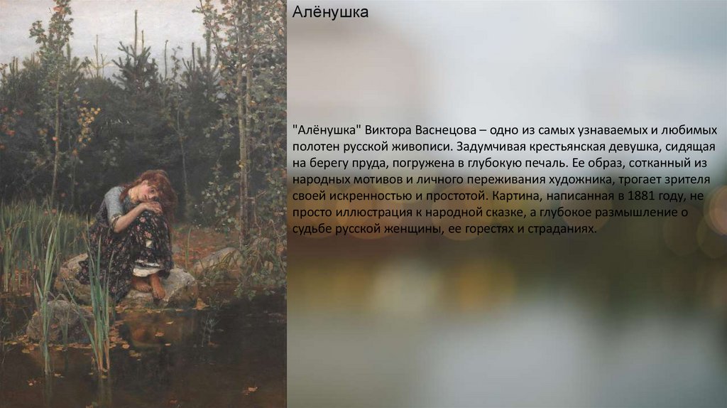 Алёнушка"Алёнушка" Виктора Васнецова – одно из самых узнаваемых и любимых