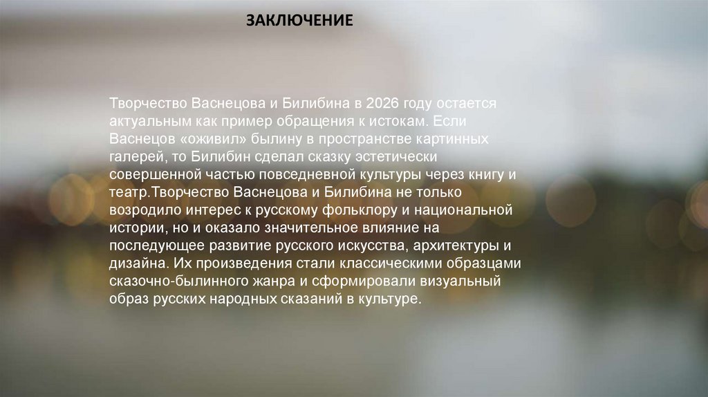 ЗАКЛЮЧЕНИЕТворчество Васнецова и Билибина в 2026 году остается