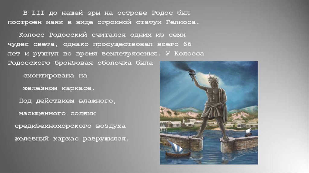В III до нашей эры на острове Родос былпостроен маяк в виде огромной статуи Гелиоса.