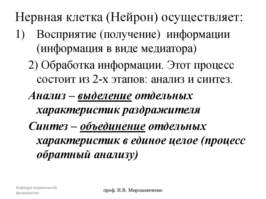 Нервная клетка (Нейрон) осуществляет:1) Восприятие (получение) информации