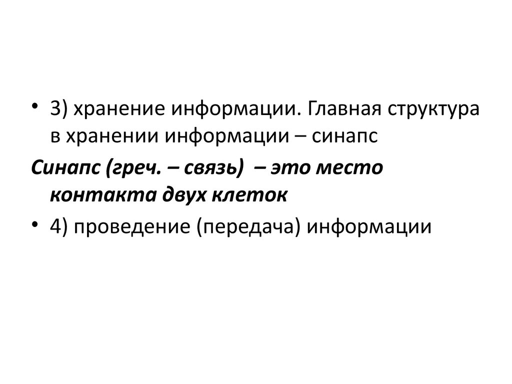• 3) хранение информации. Главная структурав хранении информации – синапс