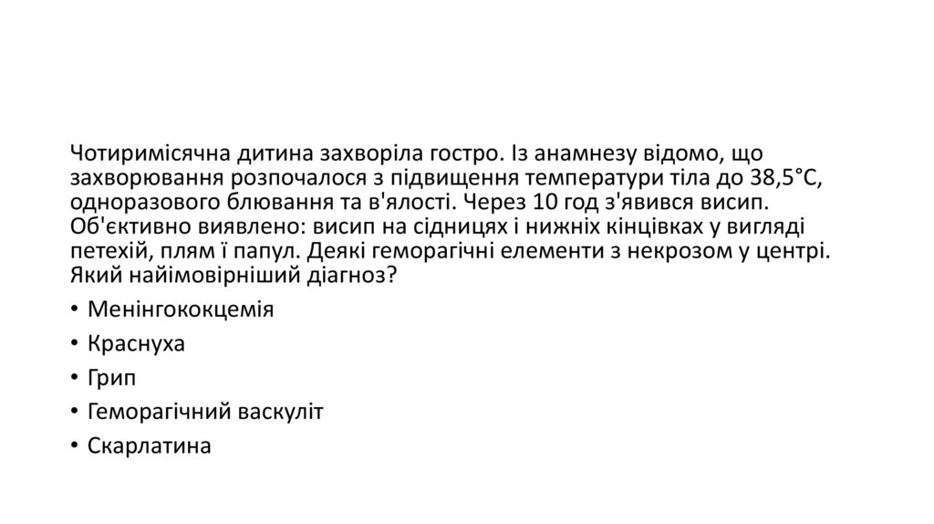 Восьмирічна дитина скаржиться на слабкість, головний біль, ознобта підвищення температури тіла до 39°C. Об’єктивно