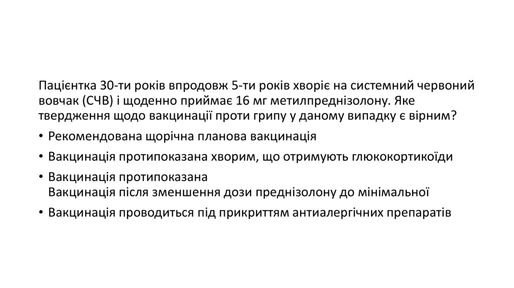 • Вакцинація протипоказана хворим, що отримують глюкокортикоїди