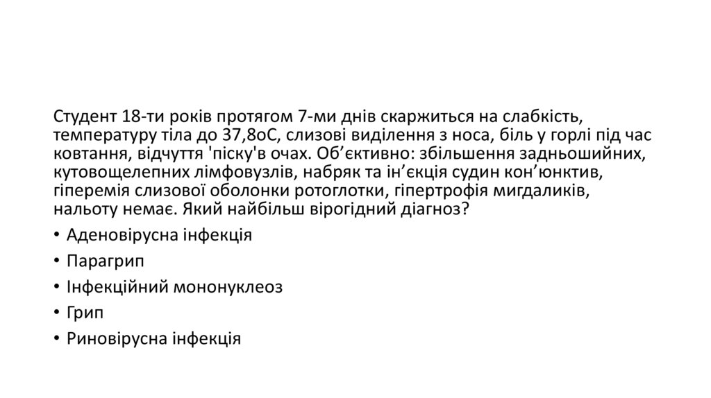 Студент 18-ти років протягом 7-ми днів скаржиться на слабкість,температуру тіла до 37,8оС, слизові виділення з носа, біль у горлі під час
