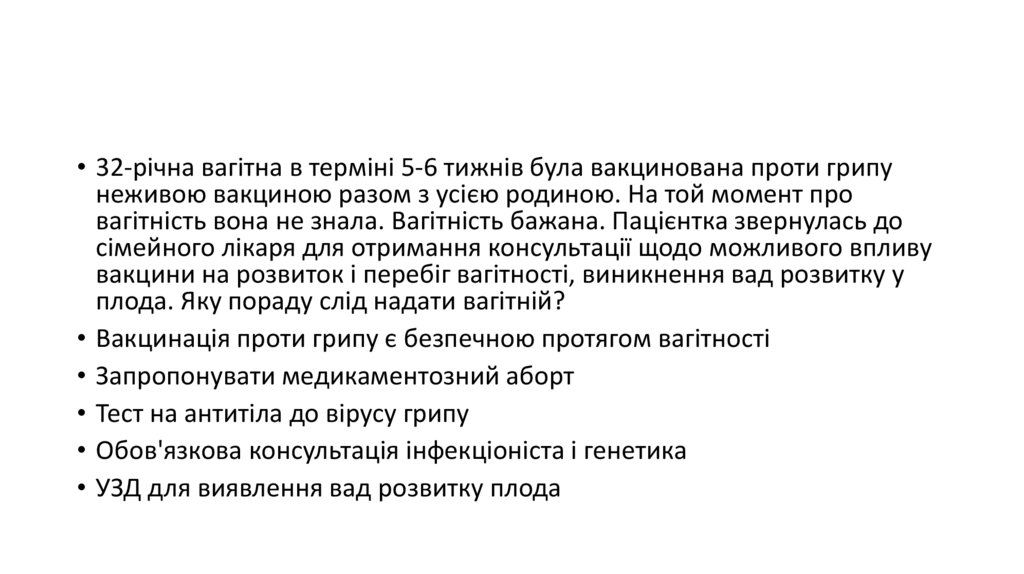 • 32-річна вагітна в терміні 5-6 тижнів була вакцинована проти грипунеживою вакциною разом з усією родиною. На той момент про
