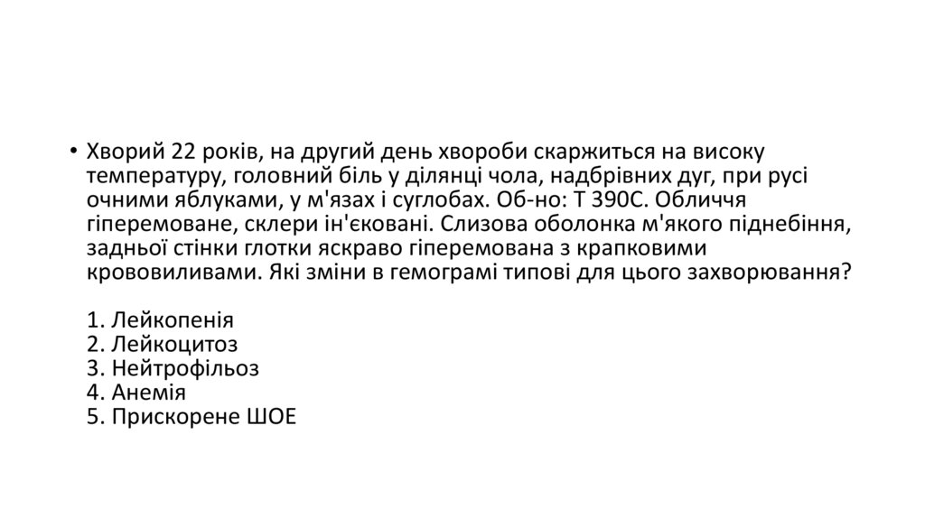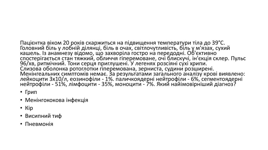 • Хворий 22 років, на другий день хвороби скаржиться на високутемпературу, головний біль у ділянці чола, надбрівних дуг, при русі