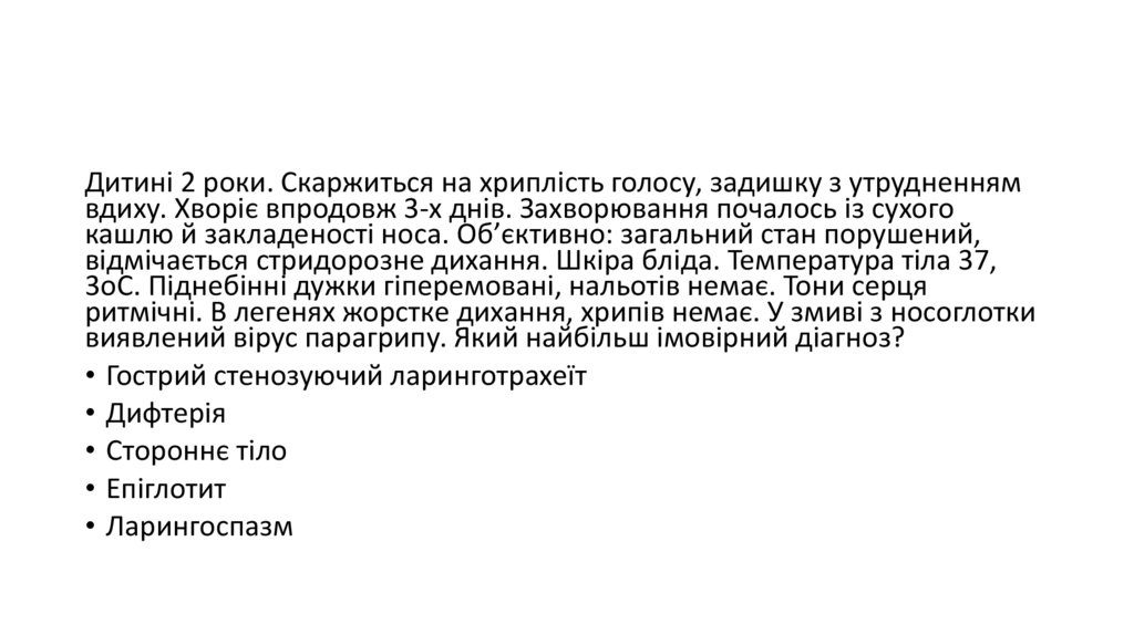 Дитині 2 роки. Скаржиться на хриплість голосу, задишку з утрудненнямвдиху. Хворіє впродовж 3-х днів. Захворювання почалось із сухого