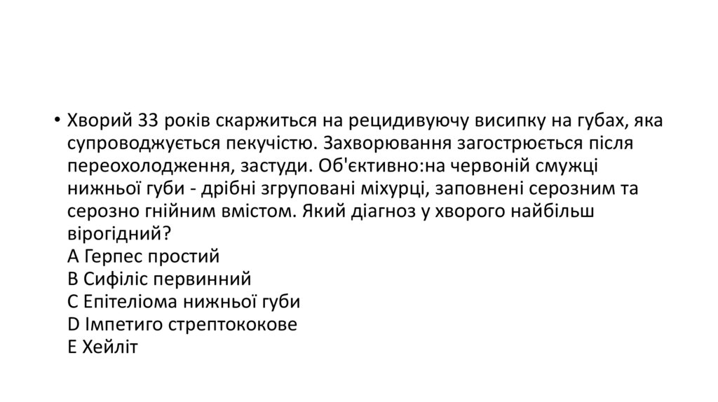 • Хворий 33 років скаржиться на рецидивуючу висипку на губах, якасупроводжується пекучістю. Захворювання загострюється після