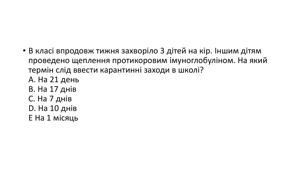 • В класі впродовж тижня захворіло 3 дітей на кір. Іншим дітямпроведено щеплення протикоровим імуноглобуліном. На який