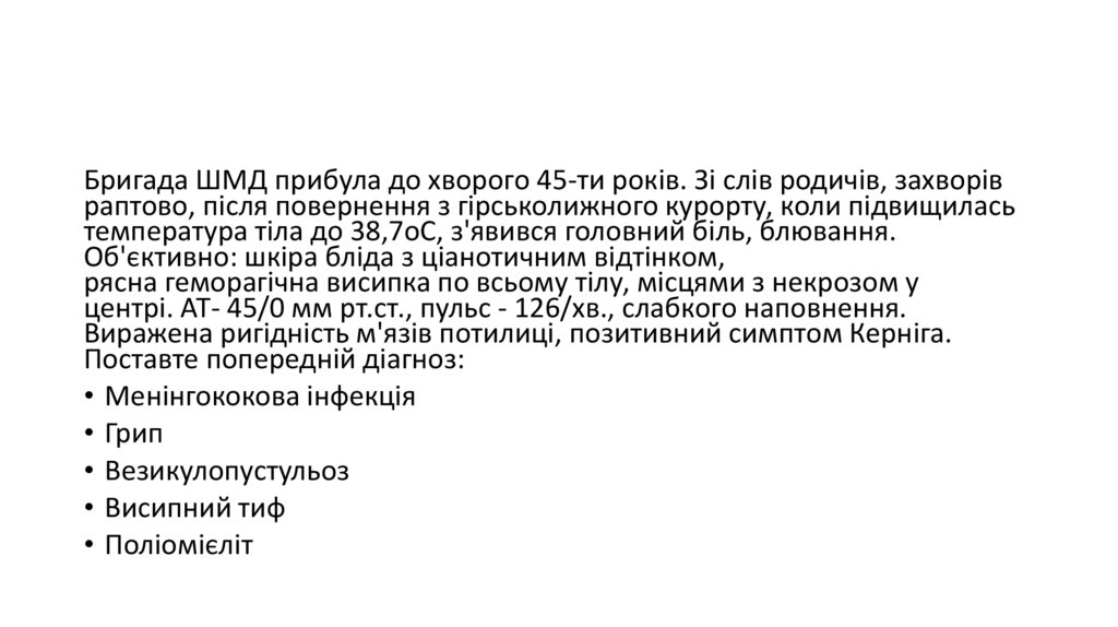 Бригада ШМД прибула до хворого 45-ти років. Зі слів родичів, захворівраптово, після повернення з гірськолижного курорту, коли підвищилась