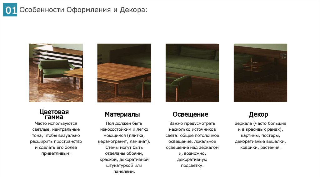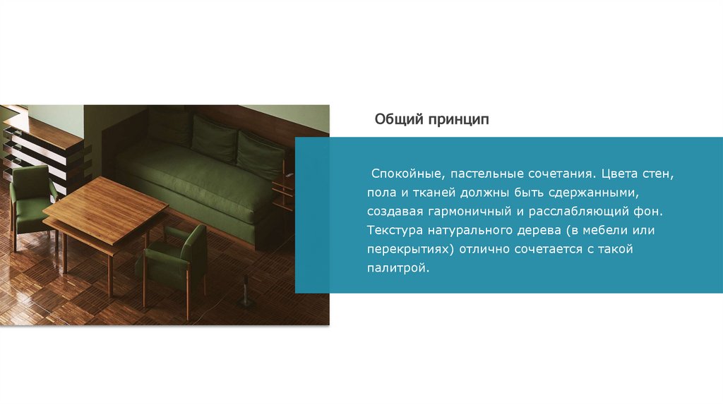 Общий принципСпокойные, пастельные сочетания. Цвета стен,