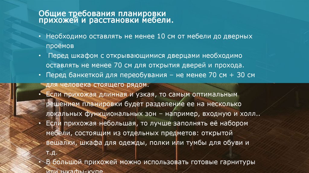 • Перед банкеткой для переобувания – не менее 70 см + 30 см