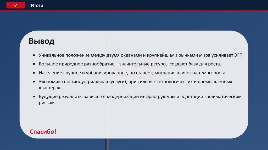 Сильная база ресурсов и инноваций, но устойчивость зависит от инфраструктуры, климата и демографии.