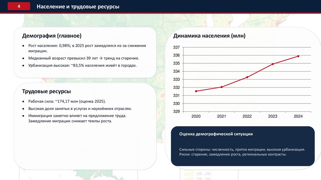 Население крупное и урбанизированное, но стареет; миграция влияет на темпы роста.
