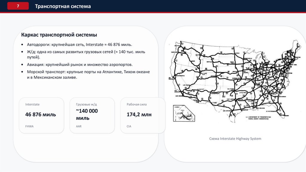 Автодороги: крупнейшая сеть, Interstate ≈ 46 876 миль.