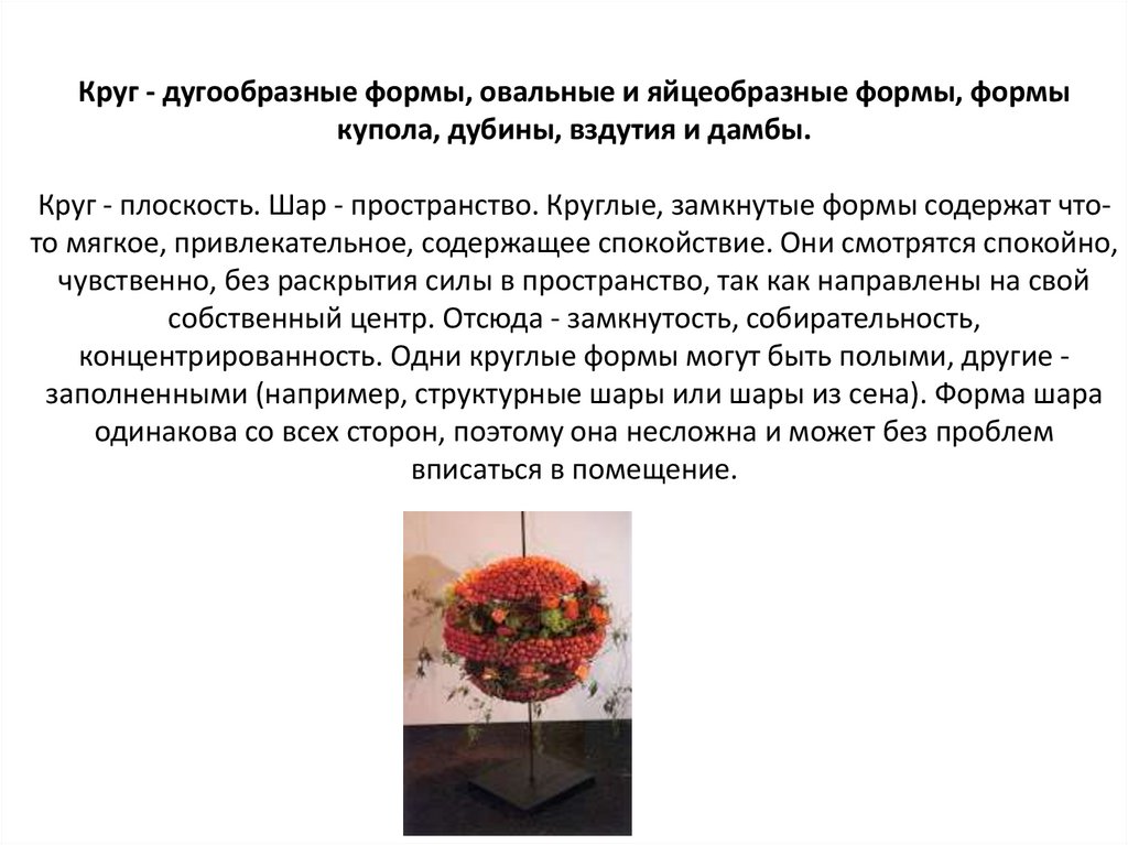 Круг - плоскость. Шар - пространство. Круглые, замкнутые формы содержат чтото мягкое, привлекательное, содержащее спокойствие. Они смотрятся спокойно,