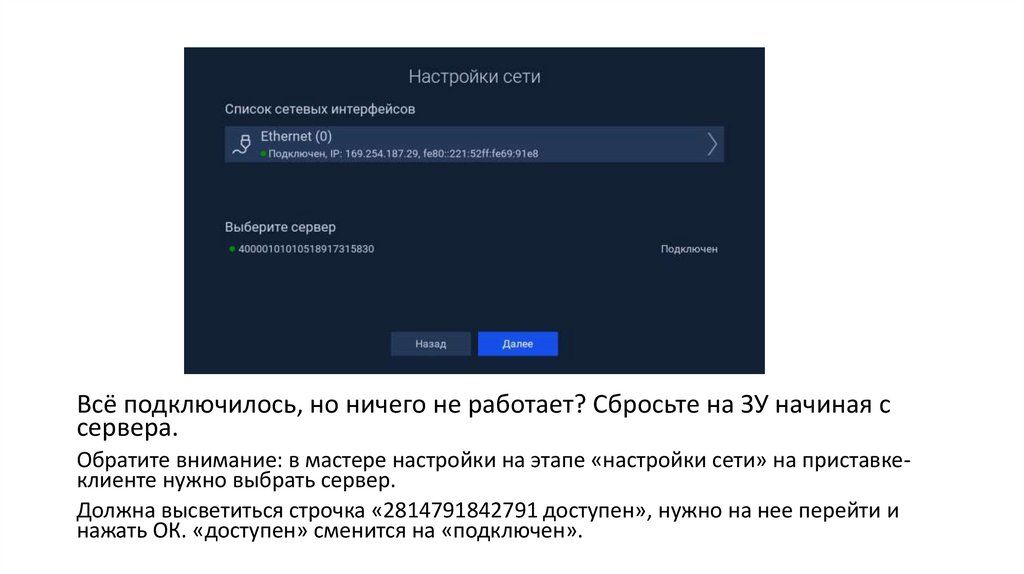 Обратите внимание: в мастере настройки на этапе «настройки сети» на приставкеклиенте нужно выбрать сервер.